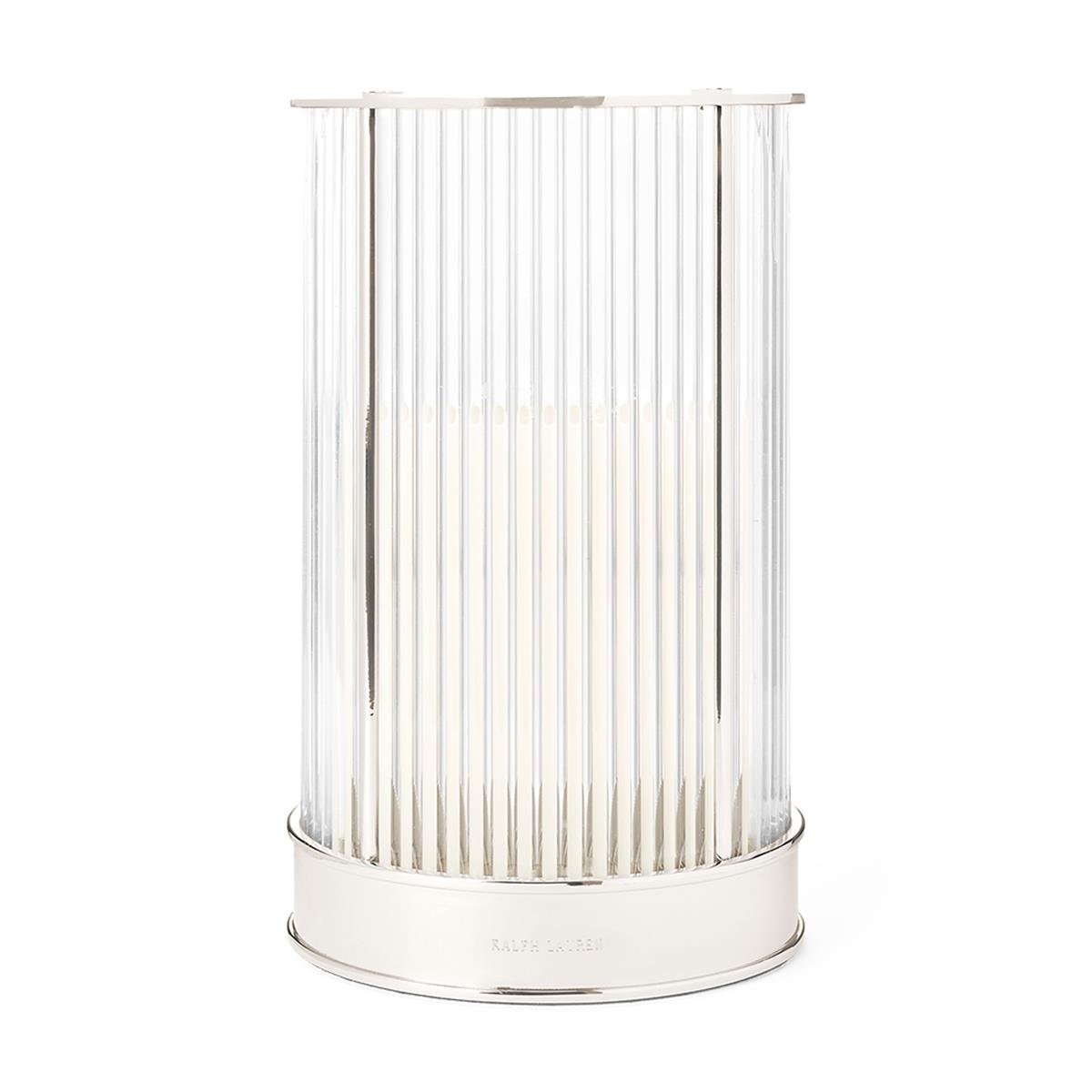 Ralph Lauren Allen geniş mumluk, cilalı nikel çerçeve ve dikey cam çubuklardan oluşan zarif silindir formuyla, hem dekoratif hem fonksiyonel bir atmosfer yaratır.